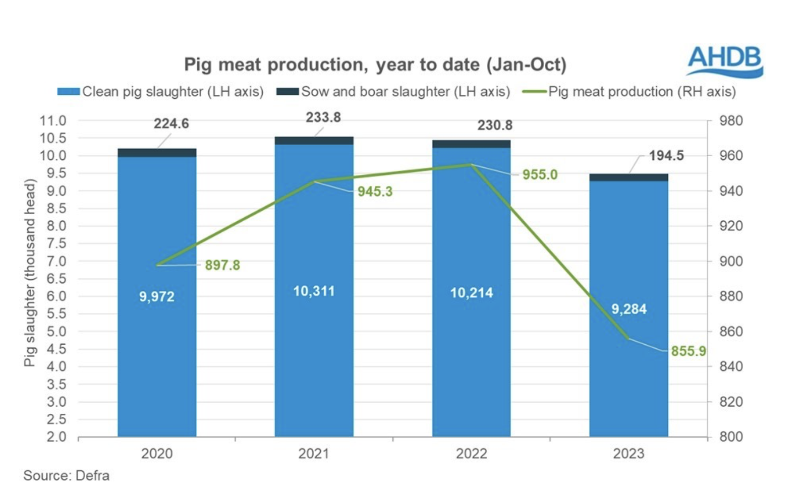 Clean pig slaughter numbers have grown to 910,500 head in November, an increase of 2.6% from October with reports of pigs being brought forward ahead of Christmas. However, numbers are down 45,900 head (4.8%) from the same time last year and 36,100 head (3.8%) behind the five-year average, as the population of fattening pigs continues to decline. Clean pig slaughter year to date (Jan – Nov) sits at 9.28m head, a drop of 9% (930,000 head) from the same period in 2022.
