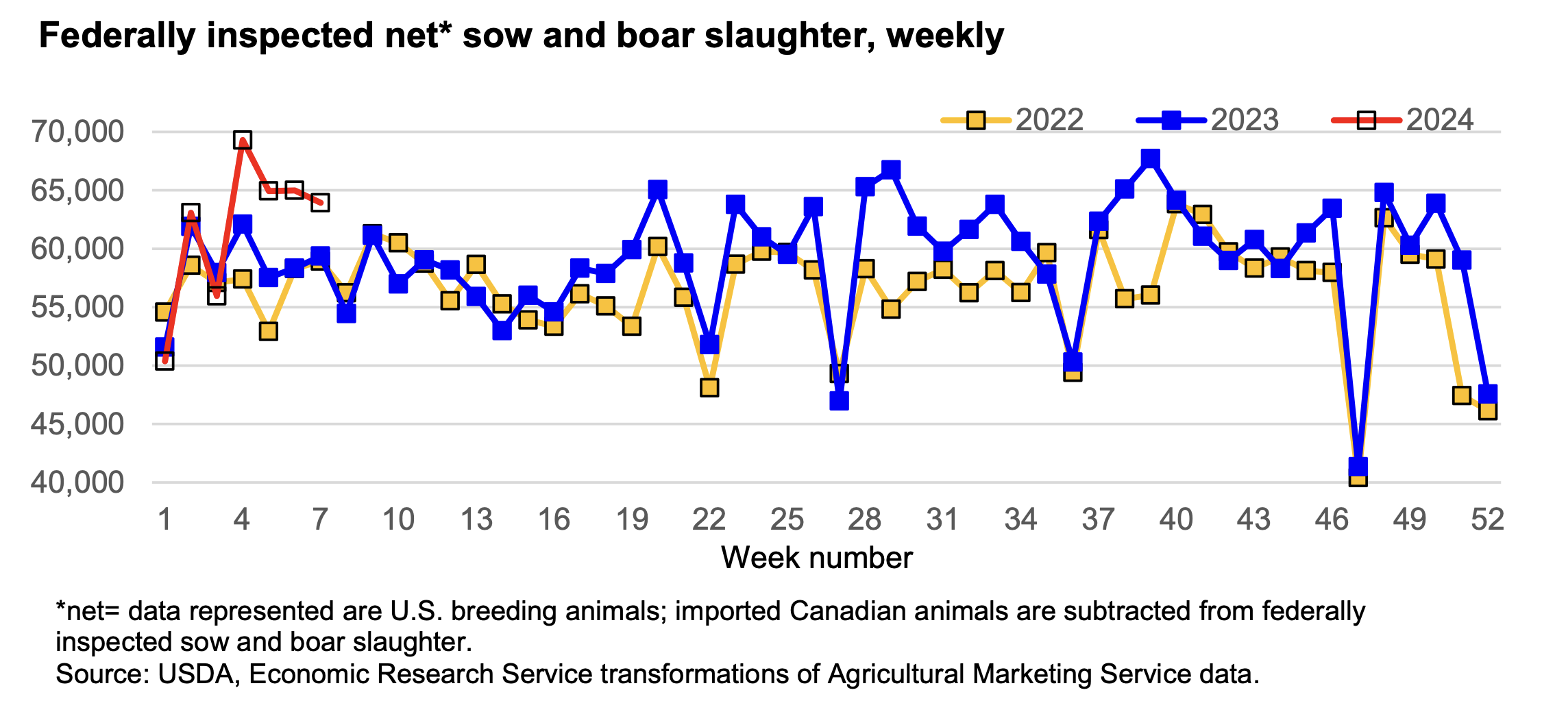 A continuation of the trend established in the first 7 weeks of 2024 would further downsize the inventory of breeding animals. Fewer breeding animals usually means fewer farrowings, which are typically associated with smaller pig crops, depending on litter rates. In general, smaller pig crops usually result in higher hog prices.