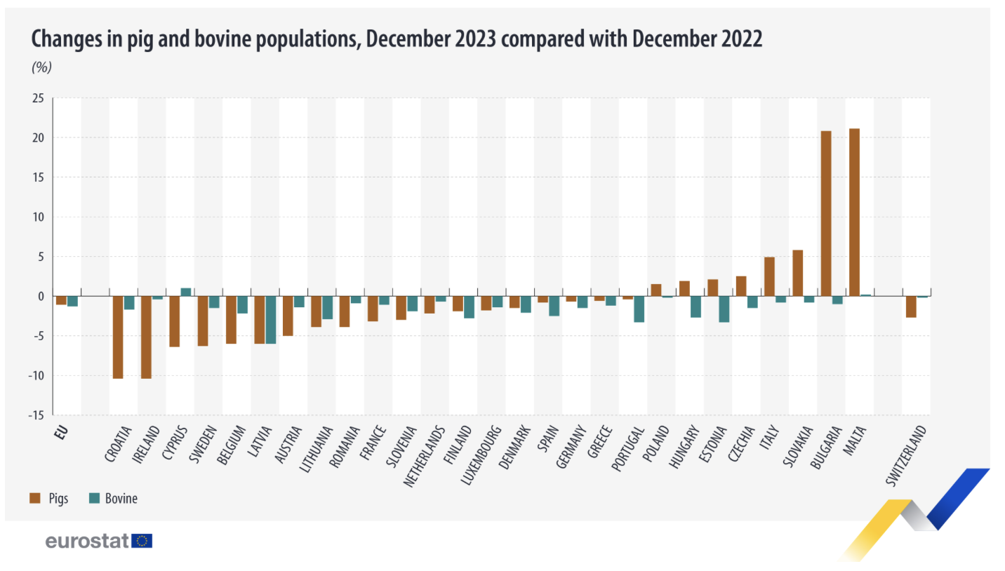 While EU-level changes in pig and bovine populations in 2023 as compared with 2022 were relatively modest, there were diverse developments among EU countries.