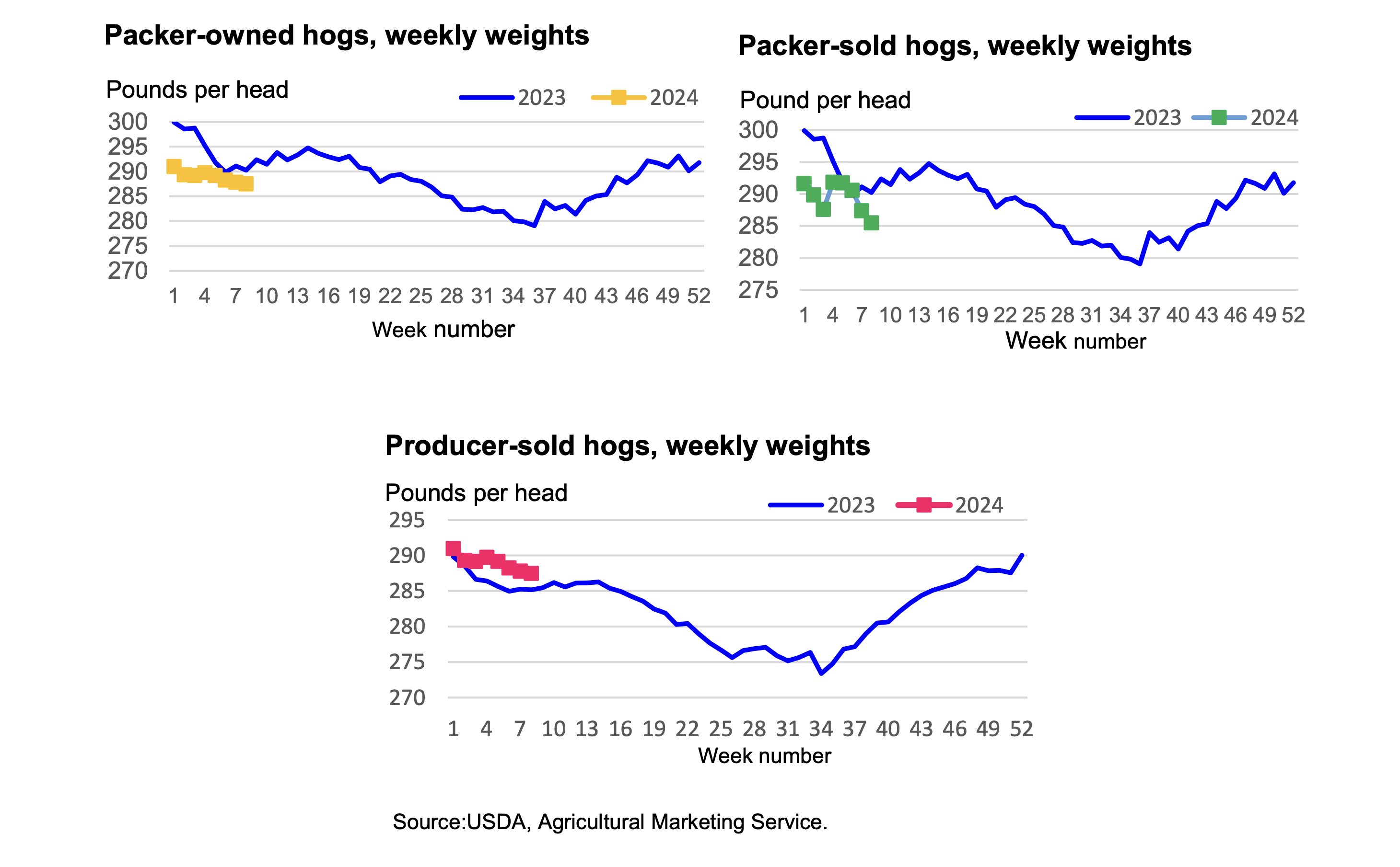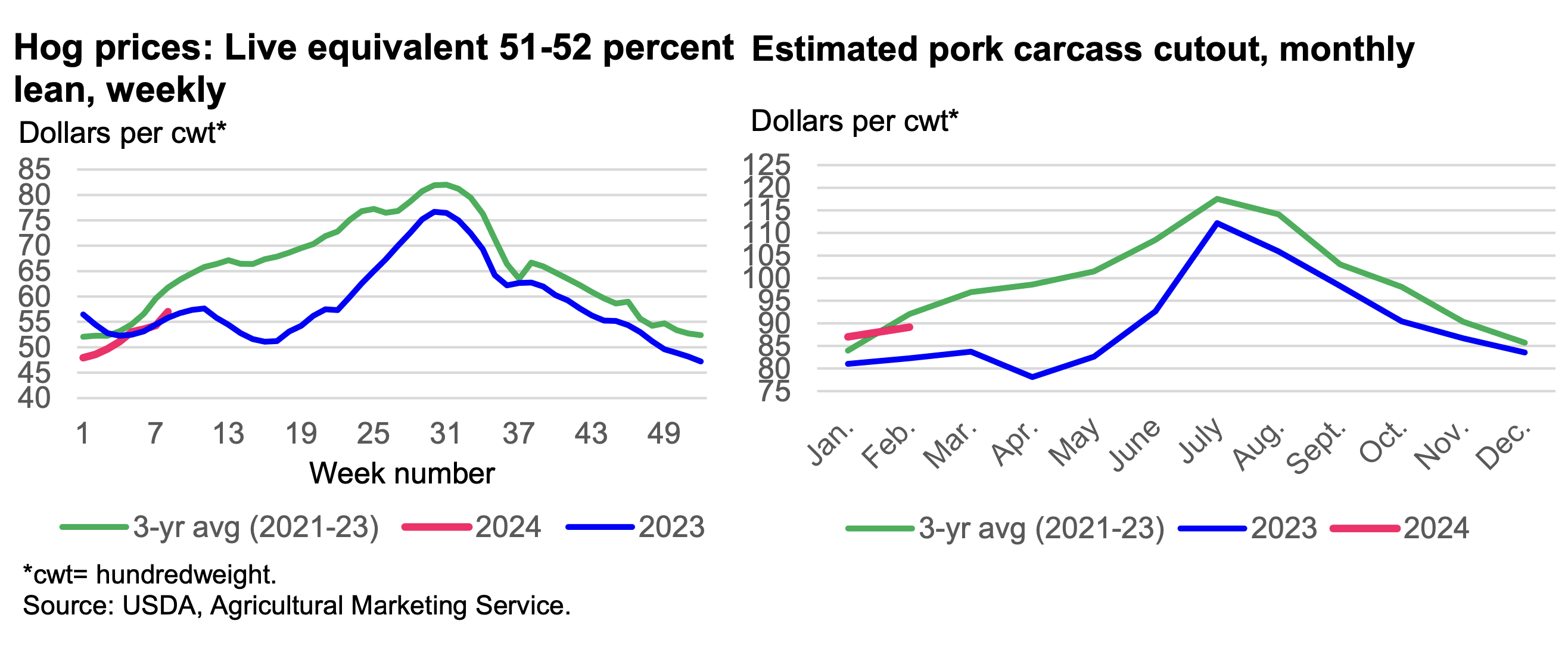 Demand for hogs in 2024 is expected to be maintained by continued strength in pork demand. Carcass cutout values for January and February suggest that while not likely to achieve 2021–22 levels, values should trend above those of 2023. Wholesale pork demand is expected to be supported by high relative retail prices of pork substitutes, generally high grocery prices in become less of a presence, particularly in Asian markets due to lower EU pork production and higher prices.