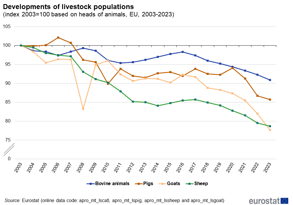 During the past 2 decades, there has been a sharp reduction in livestock populations across the EU. Between 2003 and 2023, the number of head of each livestock population decreased: the sharpest declines in percentage terms were recorded for the number of sheep and goats (both about 22%), while the smallest was in bovine animal numbers (about 9%).