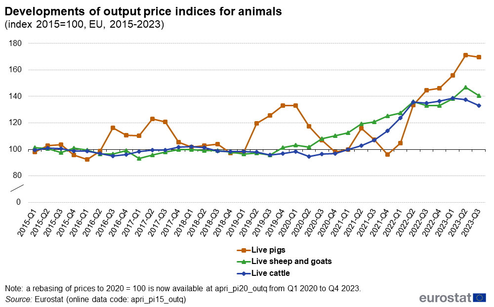The price of live pigs rose an estimated 21.8% in 2023, following an increase of 26.4% in 2022. The price of live sheep and goats rose an estimated 7.0% in 2023, following an increase of 11.0% in 2022. The price of live cattle also rose slightly in 2023 (+3.3%), after a sharp increase of 25.6% in 2022. Those price rises look to have topped out in the 3rd quarter of 2023.