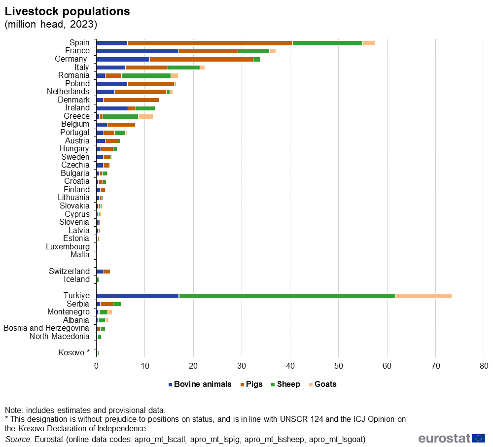 Spain accounted for about one-quarter of the EU's pig (25.4%) and sheep (23.6%) populations in 2023, while Greece had a similar share of the EU's goat population (25.8%) and France a somewhat smaller share (22.8%) of the bovine population.