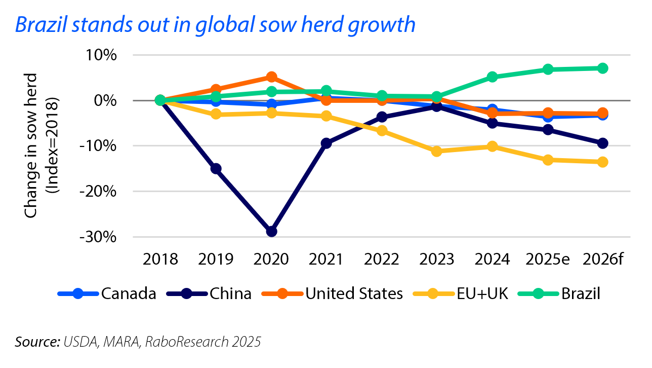 The global sow herd is projected to decline in 2026, as producers face heightened uncertainty. While tighter competing meat supplies and lower feed costs will support a favourable margin environment for most producers, the industry remains cautious on herd expansion.