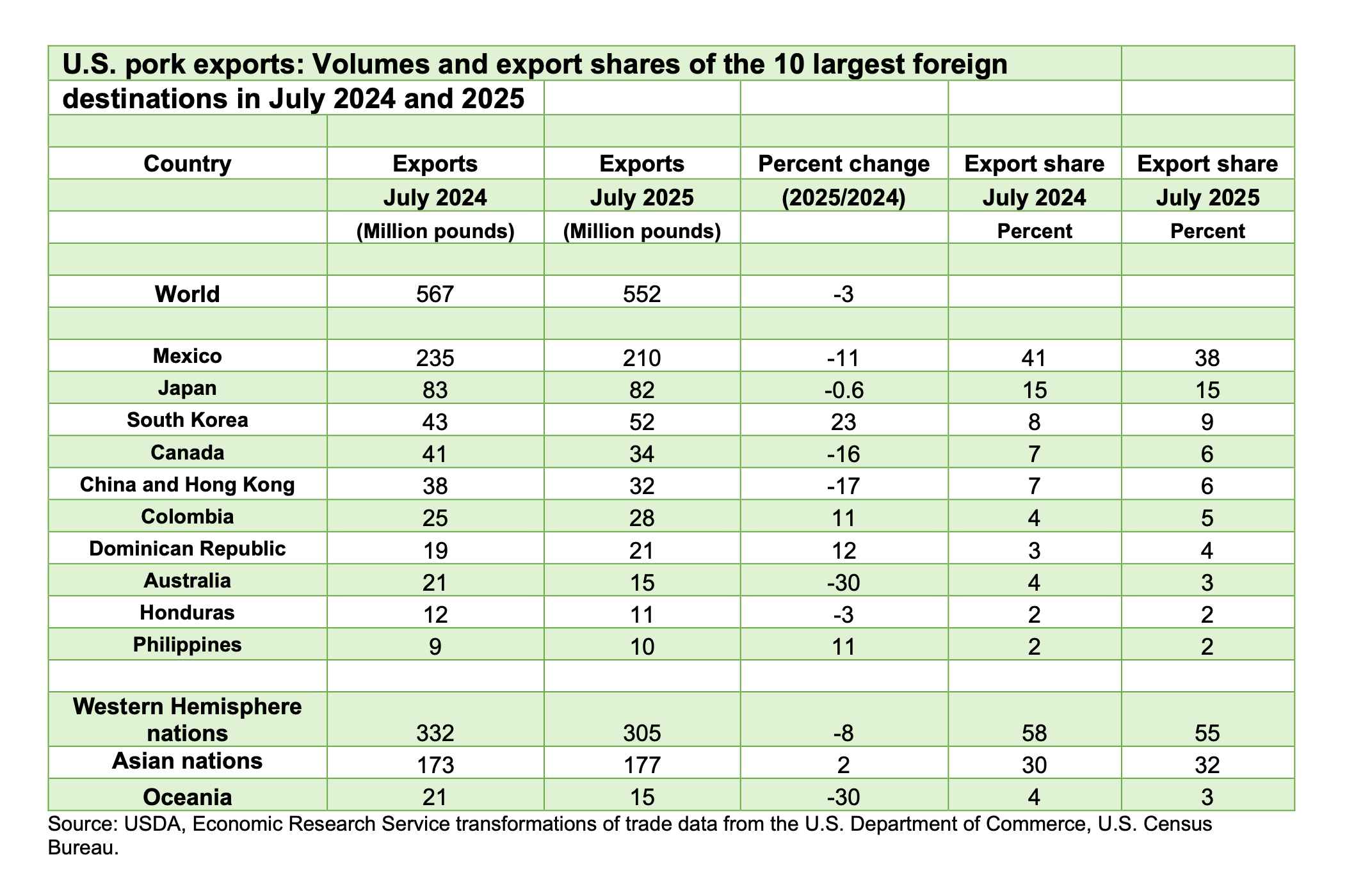 US pork exports in July were 552 million pounds, 3% below shipments in July 2024, according to the US Department of Agriculture's Livestock, Dairy, and Poultry Outlook for September.