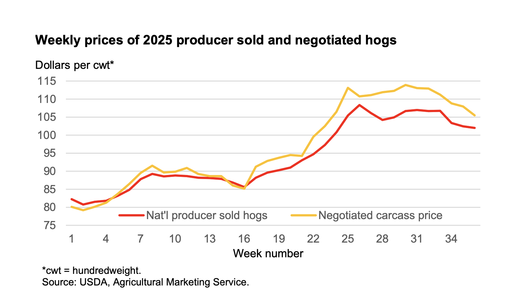 This revised forecast quantity drops third-quarter 2025 production to 2.3% below the same period of 2024. Third-quarter prices of live equivalent national producer sold hogs are unchanged from last month, at $77 per cwt, more than 17 percent higher than a year ago.