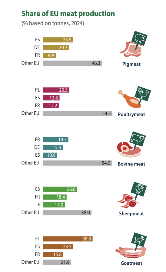 Spain, Poland and France accounted for the largest shares of European Union meat production in 2024, according to Eurostat’s Key figures on the European food chain – 2025 edition.