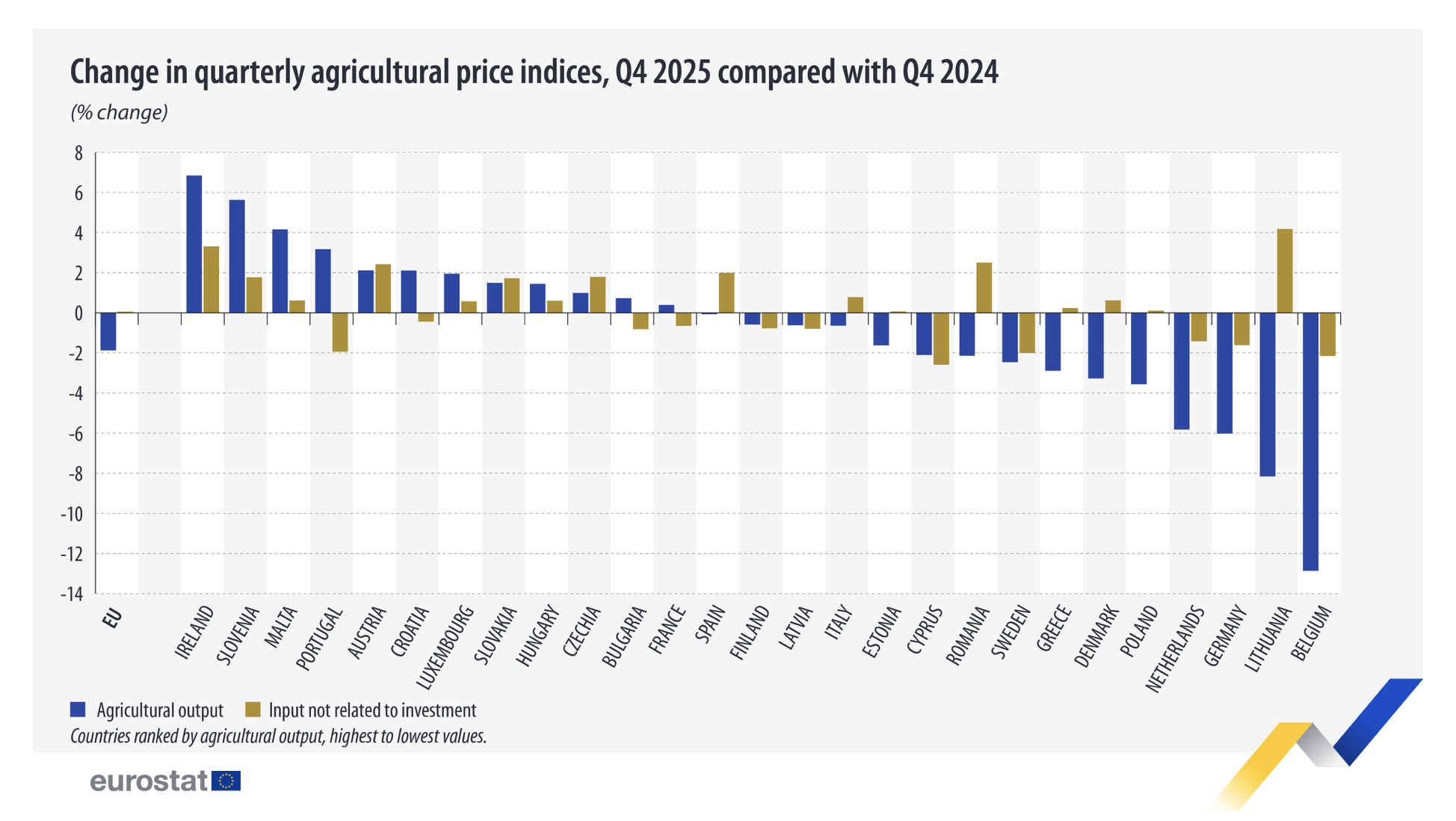 In the fourth quarter of 2025, the average price of agricultural output decreased in 15 EU countries, with the sharpest rates of decline in Belgium (-12.9% compared with the fourth quarter of 2024), Lithuania (-8.2%) and Germany (-6.0%). By contrast, prices increased in the other 12 EU countries, most notably in Ireland (+6.8%), Slovenia (+5.6%) and Malta (+4.2%).