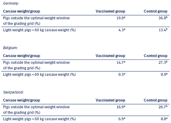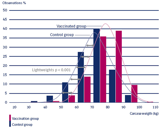 Pigs vaccinated with Enterisol® Ileitis show a lower slaughter weight variation than non-vaccinated pigs (Table 8.1.3 a; Figure 8.1.3 a). The lower percentage of pigs outside the optimal weight window and the lower percentage of lightweight pigs leads to significantly reduced weight discounts and an overall better price per kg carcase weight for vaccinated pigs when compared with non-vaccinated controls.
