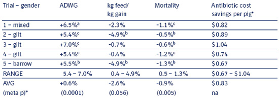 Table 8.2 b shows the range of responses seen across the 5 individual trials as well as the effect on each parameter when analyzed collectively across all 5 trials (bottom row). Trial 5 did not have clinically apparent Ileitis in the presence of continuous feed medication and may be considered a subclinical Ileitis comparison. Medication savings were based on current market prices as of July 2003.