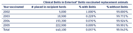 These field observations would suggest that the duration of immunity for Enterisol® Ileitis vaccinated gilts is at least 2 years and probably greater than 3½ years. This would adequately cover the entire productive life for most breeding stock in conventional herds. (Sanford 2006)