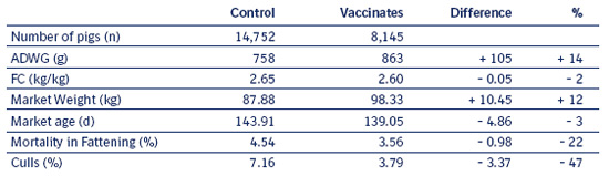 The results show a broad improvement in groups of vaccinated pigs. Even with a reduction of antimicrobial use, pigs grew faster, more consistently, and with nominally improved feed efficiency. The major economic benefits were average daily weight gain and cull percent.
