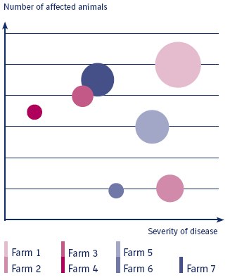 In some farms, a number of pigs may be found with mild or even undetectable clinical signs – typical for the chronic form. In farms with the acute form, usually a lower number of animals is affected but with more serious and often including fatal clinical signs. In both situations, the economic effects can be the same (e.g. farm 5 and farm 7 in Figure 2.3 a). Therefore, the economic impact of Ileitis depends rather on the specific farm situation than on the form of the disease (chronic or acute) alone.