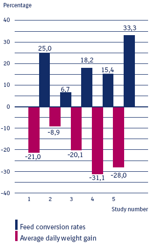 In these studies, the average weight gain of the challenged pigs was 8 to 31% less than the control pigs. Also the challenged pigs ate on average an extra 6 to 33% more feed per kg body weight gain.