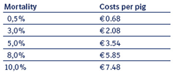 The influence of mortality on costs is due to the simple fact that only a living pig can be sold. All costs of the dead pigs (piglet, feed, facility and veterinary interventions) increase the costs for those pigs actually slaughtered. Therefore the effect of mortality on the costs per pig is generally included in the analysis by dividing the total costs of a group of pigs by the number of pigs which are actually slaughtered. Table 2.4 a shows the increase in total costs per pig due to higher mortality.