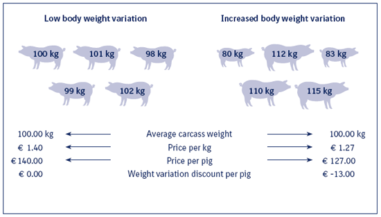 Slaughter houses in Europe pay more money for uniform pig batches compared to a group of pigs with higher body weight variation. This is justified by the fact that uniform pigs have lower slaughter processing costs (less labour, more mechanics).