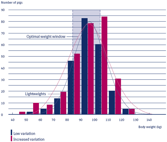 Figure 2.5 b shows 2 batches of fatteners with nearly the same average body weight but with different body weight variation (red = increased, blue = low). In the group with high body weight variation, less pigs can meet the desired optimal weight window and the percentage of lightweight pigs is increased. It should be noted that lightweight pigs (below the optimal weight window) lead to higher financial losses than heavyweight pigs (above the optimal weight window).