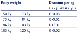 Generally, a “carcass grading grid” is applied for the payment of pigs at the slaughter house, which basically includes region and slaughter house specific settings for the base price, for the discounts per kg slaughter weight above/below the desired weight window and for premiums and discounts per % meat content. Especially light weight pigs below the desired weight window have a substantial influence on the average carcass price of the whole group even if the majority of the pigs meet the desired weight window specifications. The financial loss in €/pig due to not meeting the desired body weight specification is called “weight discounts” or “packer penalty”. A weight discount of €1 for a group of pigs means that on average each pig of the slaughtered batch will loose €1 due to the fact that some pigs of the group can not meet the desired weight window.