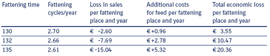 With increased fattening time, less pork can be sold per fattening place. The lost opportunity is about 2.6 ¤/fattening place and year (per additional day in fattening). The additional costs for feed are about ¤0.96 per fattening place. This shows that the longer fattening time has a substantial influence on the throughput and the resulting return on investment in fattening.