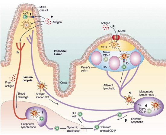 Antigen might enter through the microfold (M) cells in the follicle-associated epithelium (FAE) (a), and after transfer to local dendritic cells (DCs), might then be presented directly to T cells in the Peyer’s patch (b). Alternatively, antigen or antigen-loaded DCs from the Peyer’s patch might gain access to draining lymph (c), with subsequent T-cell recognition in the mesenteric lymph nodes (MLNs) (d). A similar process of antigen or antigen-presenting cell (APC) dissemination to MLNs might occur if antigen enters through the epithelium covering the villus lamina propria (e), but in this case, there is the further possibility that MHC class II+ enterocytes might act as local APCs (f). In all cases, the antigen-responsive CD4+ T cells acquire expression of the α47 integrin and the chemokine receptor CCR9, leave the MLN in the efferent lymph (g) and after entering the bloodstream through the thoracic duct, exit into the mucosa through vessels in the lamina propria. T cells which have recognized antigen first in the MLN might also disseminate from the bloodstream throughout the peripheral immune system. Antigen might also gain direct access to the bloodstream from the gut (h) and interact with T cells in peripheral lymphoid tissues (i). Mowat/Nature Reviews – Immunology Vol. 3, April 2003, 331-341
