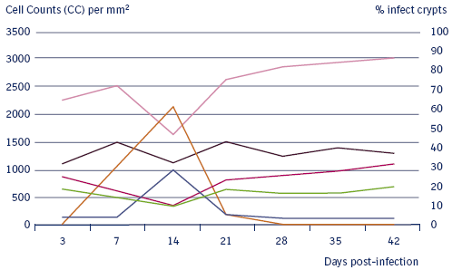 Macrophages were present in larger numbers in crypts showing hyperplastic lesions as compared to those infected but not hyperplastic. This massive infiltration of activated macrophages, peaking on day 14, may be the key factor in the development of the haemorrhagic form of the disease. (Figure 3.2 b)