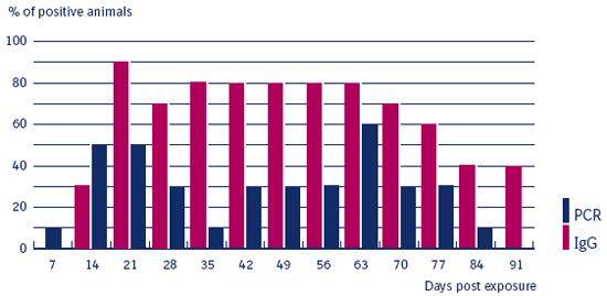 Information has recently become available about the humoral immune response in pigs naturally or experimentally infected with L.intracellularis. In one study, IgG could be first detected two weeks after challenge of 5-week-old pigs with pure culture of L.intracellularis. Antibody levels (IgG) peaked around the end of the third week and then tended to drop (Knittel et al. 1998).