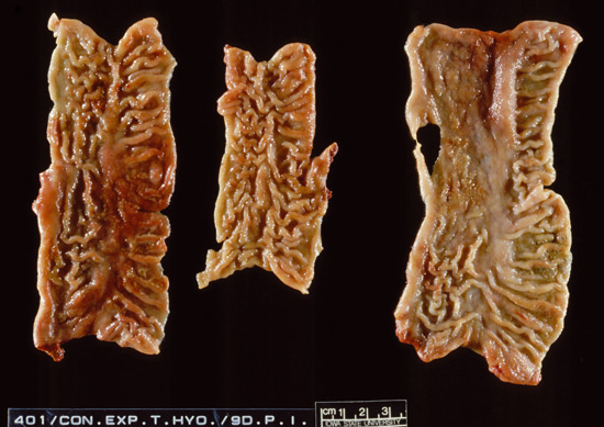 Three examples of colonic mucosa with lesions due to Brachyspira hyodysenteriae, 9 days post experimental infection.