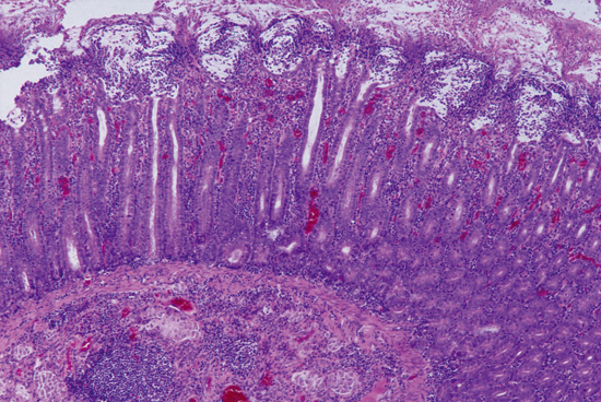 Histological section of proximal colon nine days p.i. with Brachyspira hyodysenteria: Crypt proliferation and dilatation of crypts, filled with debris. Severe necrosis on surface; moderate cellular infiltration in lamina propria and sub mucosa.