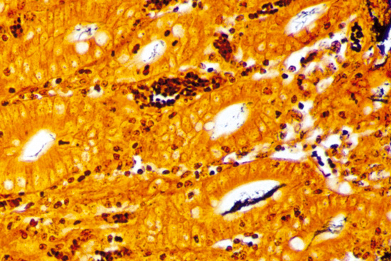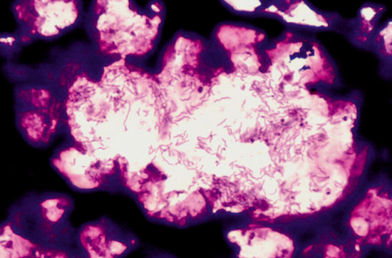 Silver staining (W&S) of a colonic section of a pig, infected with Brachyspira hyodysenteria: Cork screw-like black stained bacteria in the lumen of crypts (~500x). Note that Lawsonia intracellularis will also be stained by this method. For clear differentiation use IHC with specific monoclonal antibodies.