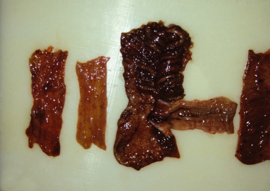 Haemorrhagic to fibrinous Enteritis in small and large intestine from a fattening pig experimentally infected with hog cholera virus: small intestine at the right side, parts of ileum, caecum, and colon in the middle, and 2 colonic samples at the left side.