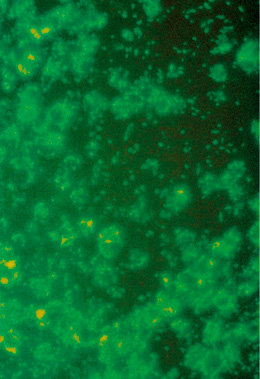 Immunofluorescence is evaluated using an UV microscope. An inverted microscope is used in case of 96 well microtiter plates.