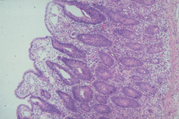 Porcine ileum with PIA: Short intestinal villi covered with flat to cuboidal epithelial cells, sub epithelial oedema and proliferating crypts. There are two to three layers of crypt epithelial cells, loss of goblet cells, increased numbers of mitotic figures and intraepithelial cells, and a mild to moderate inflammatory reaction in the lamina propria (~125x).