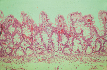 Histopathological findings vary but in all cases the baseline is as follows: In small intestine villi are short or completely lost and the surface epithelium is cuboidal or flattened. Lymphatics may be distended. The mucosa is thickened by proliferating crypts, which is the same in caecum and colon. There are four to five layers of intensely stained epithelial cells and goblet cells are sparse or missing. The mitotic rate in crypts is increased and in some crypt lumina cellular debris is accumulating(see pict 5.2.1 b). In comparison to an uninfected mucosa (see pict. 5.2.1 c), there is a mild to moderate inflammatory response in the lamina propria, sometimes even extending in deeper layers.