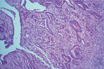 branching crypts, some of them filled with cellular debris, necrosis on surface (125x).