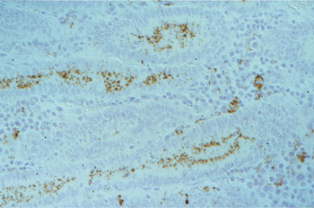 IHC (immunoperoxidase) of a section of ileum with PIA: dark brown bacteria in enterocytes of crypts and in macrophages of the lamina propria (250x).