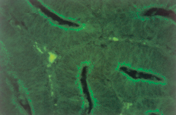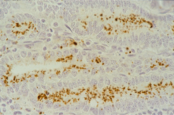 Lawsonia intracellularis cannot be detected by H&E stain. IHC does, reveal a specific reaction of the intracellular organism. The monoclonal antibodies used for Immunohistochemistry can be labeled for a direct in situ immunoperoxidase staining (see pict. 5.2.1 e) or immunofluorescense staining (see pict. 5.2.1 g). This specific reaction is detectable in most of the cases at the luminal aspect of the infected crypt cells, and is occasionally present in macrophages of the lamina propria. In a higher power magnification, there are increased numbers of intraepithelial lymphocytes and a few apoptotic figures recognizable (pict. 5.2.1 f).